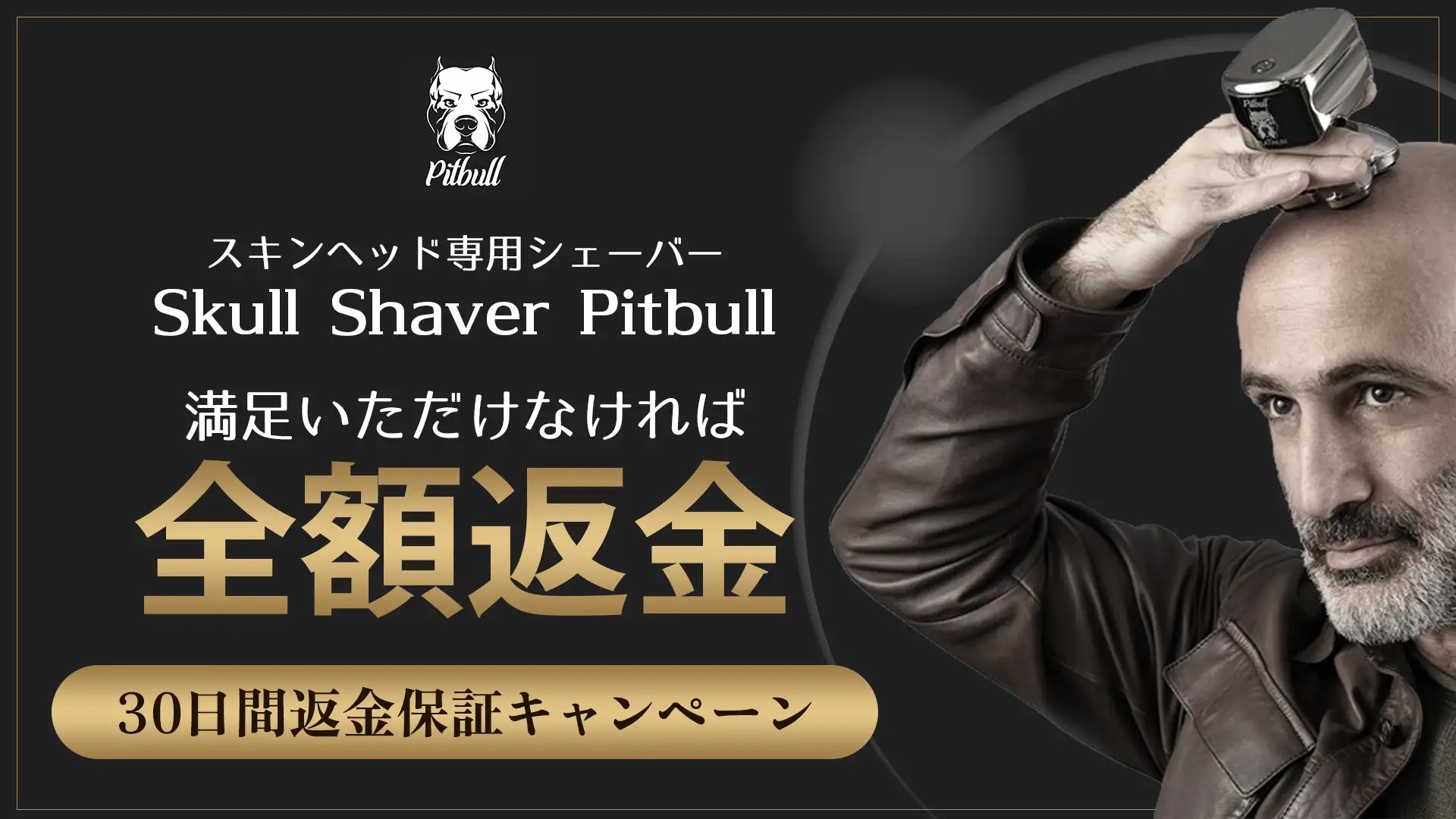 この商品を「買って失敗したらどうしよう」と考えると、ポチッと押すのはなかなか勇気がいると思います。お客様の「買って失敗した」をなくし、多くの方に「Skull Shaver Pitbull」の良さを実感いただくために、実際に使って満足されなければ全額を返金する「30日間返金保証キャンペーン」を行います。本キャンペーンでは、対象期間中に「Skull Shaver Pitbull」シリーズをご購入いただいた方に対し、万が一ご満足いただけなかった場合、購入日から30日以内であれば理由を問わず全額返金を保証いたします。